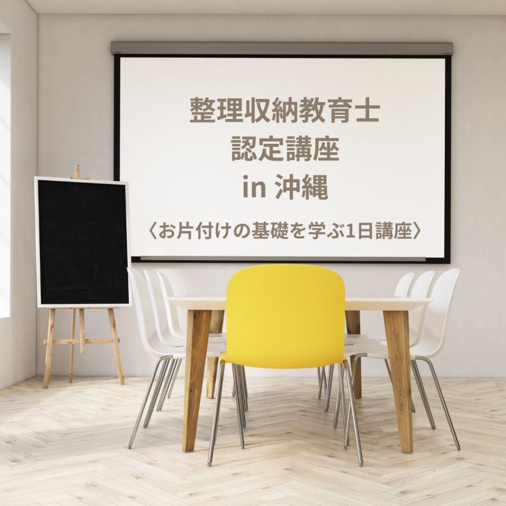 沖縄で学べる!\一生モノの整理収納スキル/一つの講座なのに、視点を変えるとだけでたくさんの学びがあります。整理収納のスキルは、一生モノの財産です。まずは、節約・子育て・終活と3つの視点をお楽しみください。